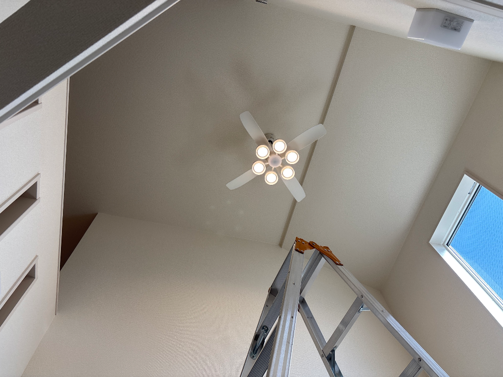 通常2mちょいの高さの天井に取り付けてますが、たまに吹き抜けの天井への取り付けなども行います。